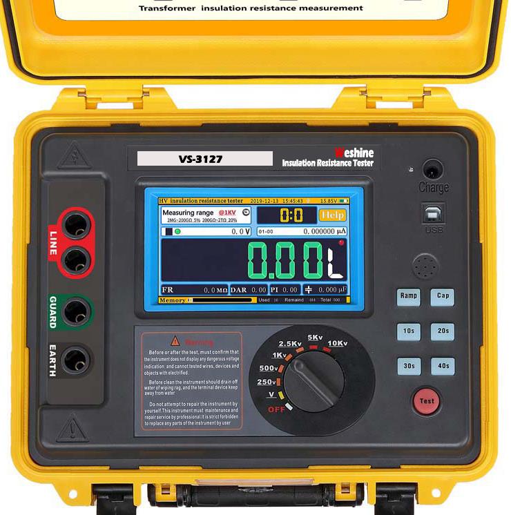 VS-3127 VS-3127Transformadorearen isolamendu-probaisolamendu-erresistentzia neurketa zehatzak egiteko gaitasuna eskaintzen du 15 kV-ko proba-tentsiora arte, 30 TΩ-ko erresistentzia maximoarekin. Erresistentzia neurtzeko zehaztasuna ± % 5 da 1 MΩ-tik 3 TΩ-ra! Utilitate eta zerbitzu enpresentzat VS-3127 probatzaile osoa da bere malgutasuna eta etorkizuneko froga-gaitasunarekin. Weshine VS-3127 lan egiten duzun lekuan lan egiteko diseinatuta dago. Irteerako tentsio nominala gehienez 7 engranajeetara iristen da (250V,500V,1KV,2.5KV,5KV,10KV,15KV). Zirkuitu laburren korronte maximoa 7 mA Isolamendu-erresistentzia proba (IR), polarizazio-indizearen proba (PI), xurgapen dielektrikoaren ratioa (DAR). Arrapala proba modua (RAMP), iragazitako erresistentzia proba modua (FR). *Kapazitate proba (Kap.). Tentsio monitorearen funtzioa, neurtutako tentsio bizia automatikoki kontrolatuz